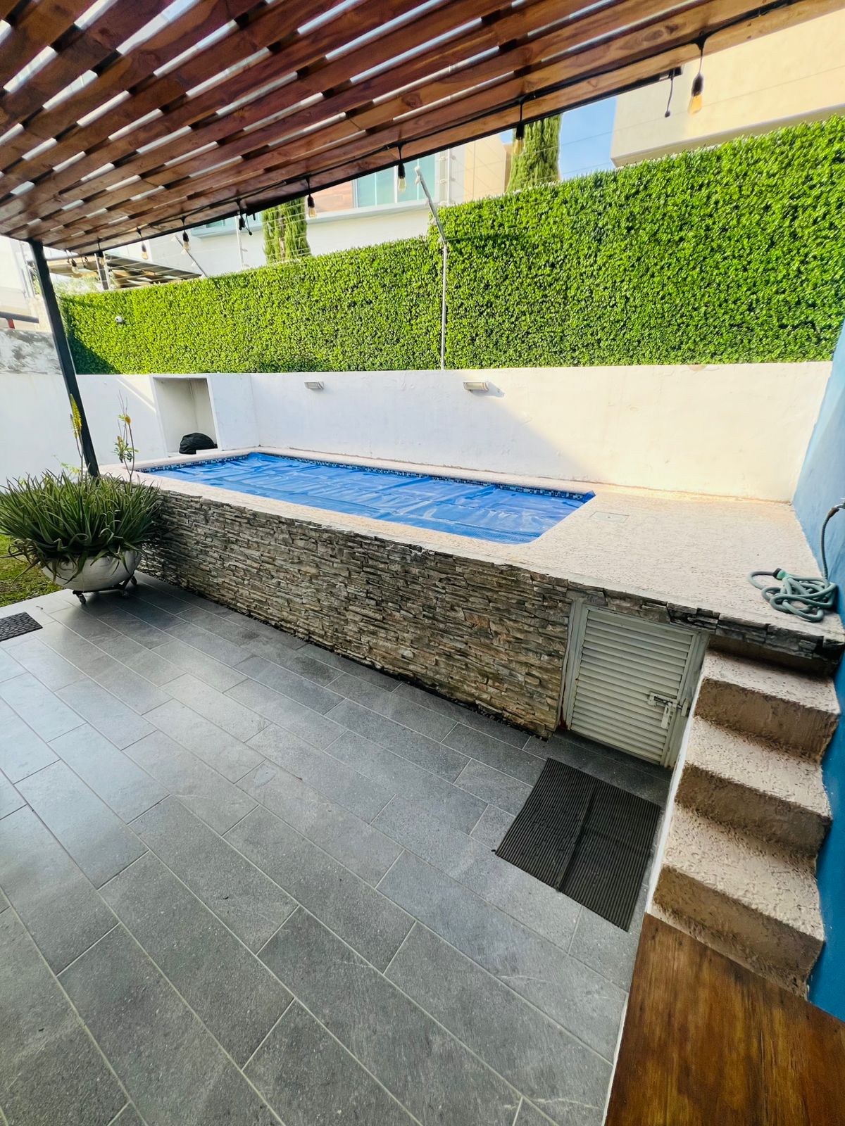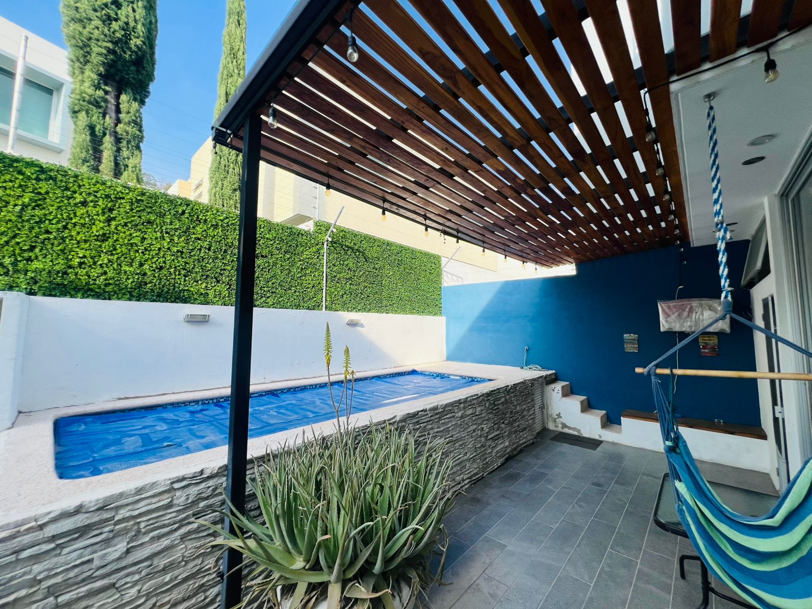 Cuenta con 4 recámaras, 4.5 baños, sala de TV, estudio, cocina integral, terraza con su propia alberca, y cochera para 3 autos.