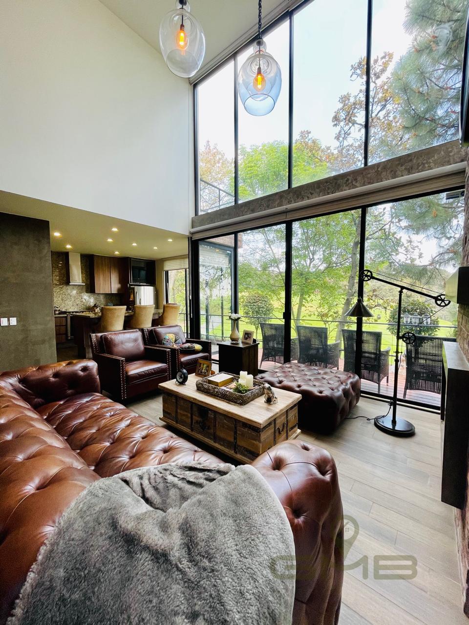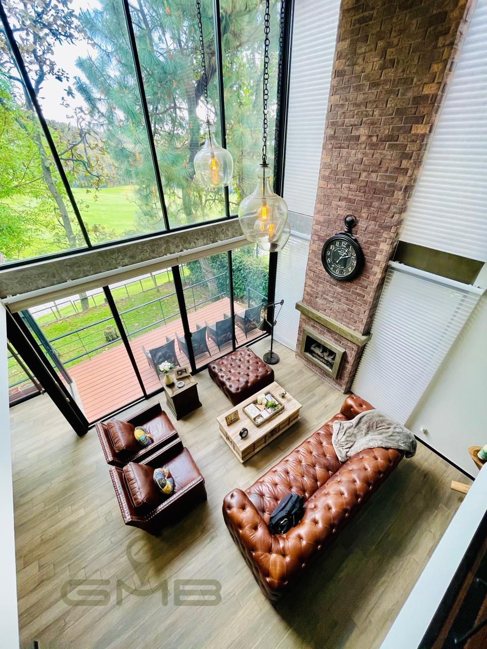 Una sala de doble altura, enmarcada por ventanales de piso a techo, regala una vista directa al bosque, creando un ambiente armónico, elegante y lleno de luz natural.