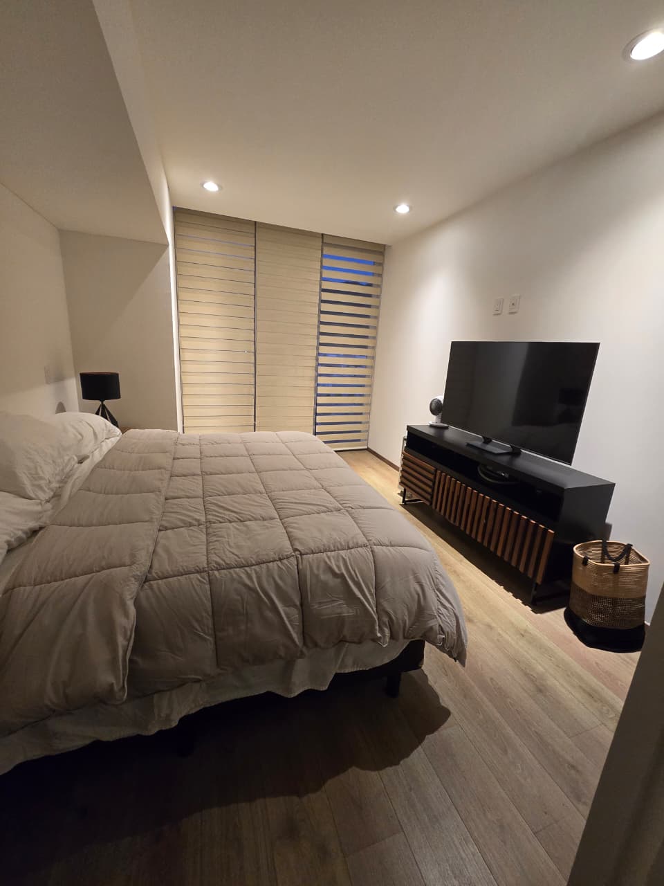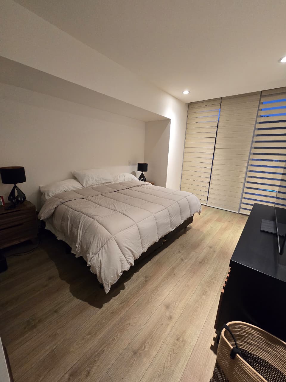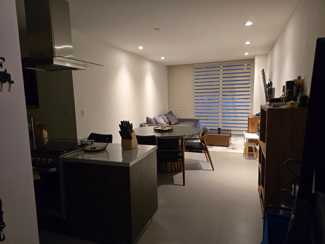 El departamento consta de dos recámaras: la principal, con un amplio vestidor y baño propio, y la segunda con un cómodo closet. Ambas recámaras y la sala-comedor.